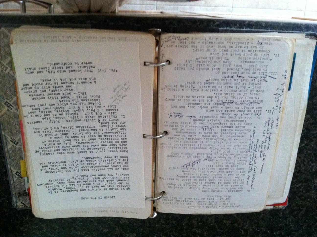 When I was ten, my mother died suddenly and unexpectedly.  It was a life-changing and defining event.  When my grandparents left after the funeral, Daddy sent her notebook with them.  Mommy’s notebook is a collection of poems, sayings, songs, and quotes on a variety of subjects.  I had to make a file when I was in college.  This was my mother’s file and through the years she added to it.  She added notes from messages and seminars.  She added notes of presentations she gave to ladies groups with her own handwritten comments in the margins.  Notes of memories.  Notes scribbled over by a child who was practicing the letter “M” a lot.